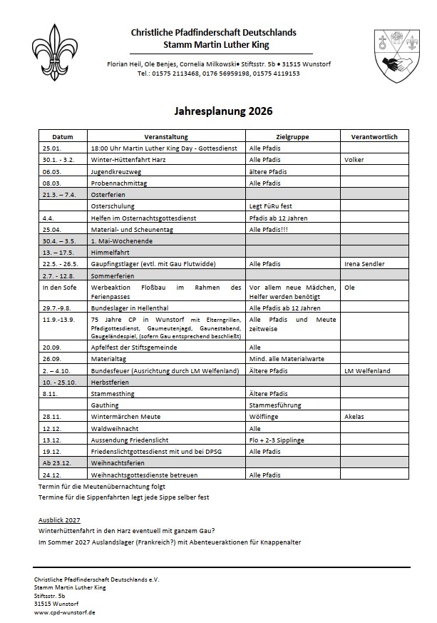 Termine Zum Vergrößern bzw. als PDF zum Download einfach anklicken._____________________________________Die Anmeldung fürs Bundeslager 202629.7. – 9.8.2026sind erfolgt.Wer jetzt noch mit möchte (ab 12 Jahren), muss sich schnellstens melden, dann können wir zu erhöhtem Lagerbeitrag noch nachmelden.